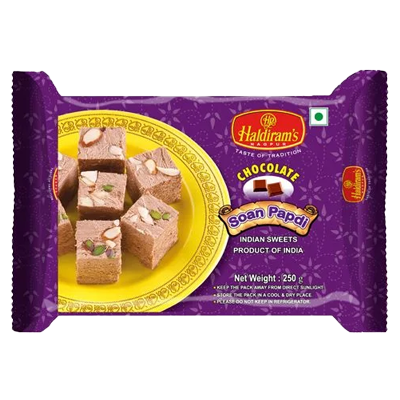 Haldirams Soan Papdi Chocolate is a delightful fusion of traditional Indian soan papdi and rich chocolate, offering a unique twist on a classic sweet. This melt-in-your-mouth confection combines the flaky texture of soan papdi with the indulgent taste of chocolate, making it a perfect treat for festivals, celebrations, or personal indulgence.